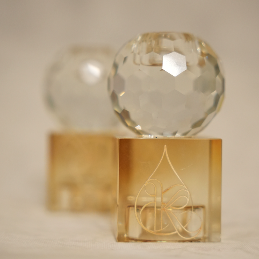 Sublimez l'entrée et la sortie du Shabbat avec une seule pièce maîtresse. Imaginé par Kidoush, ce duo de bougeoirs réinvente la Judaïca avec une architecture audacieuse : la pureté d'une sphère en cristal reposant sur un socle cubique teinté Ambre.